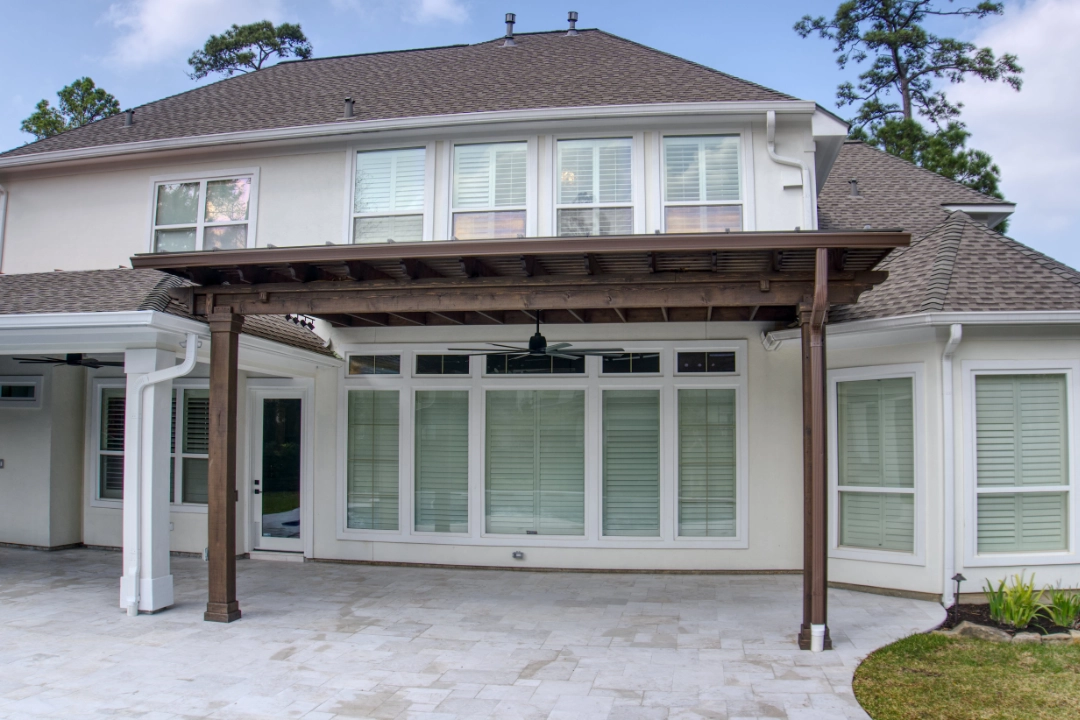 A custom cedar pergola, attached to the home, adds shade and architectural interest.