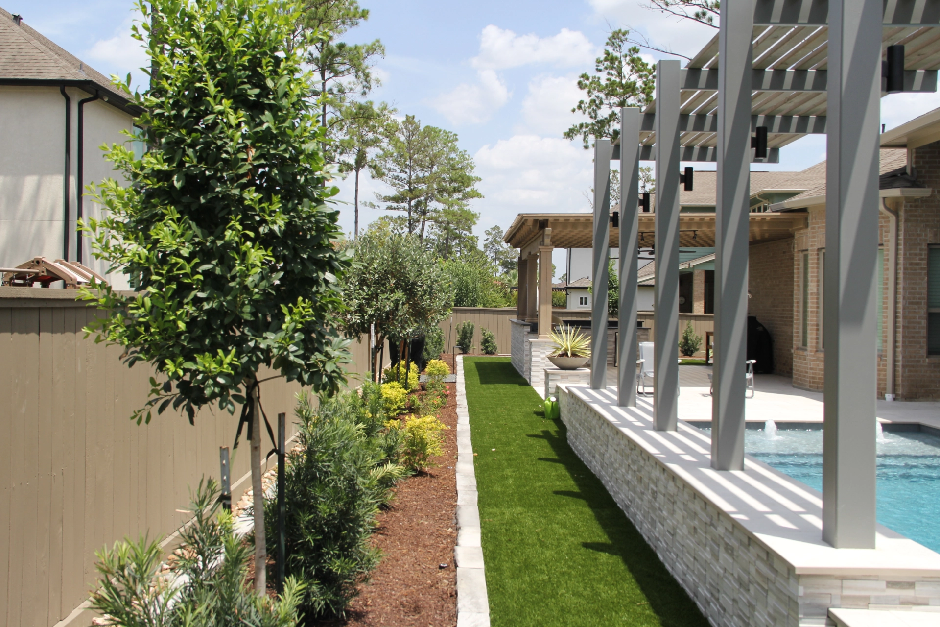 Strategically placed artificial turf provides a low-maintenance, always-green contrast to the hardscaping. It softens transitions, creates a visual break between materials, and enhances the comfort and usability of the yard year-round.