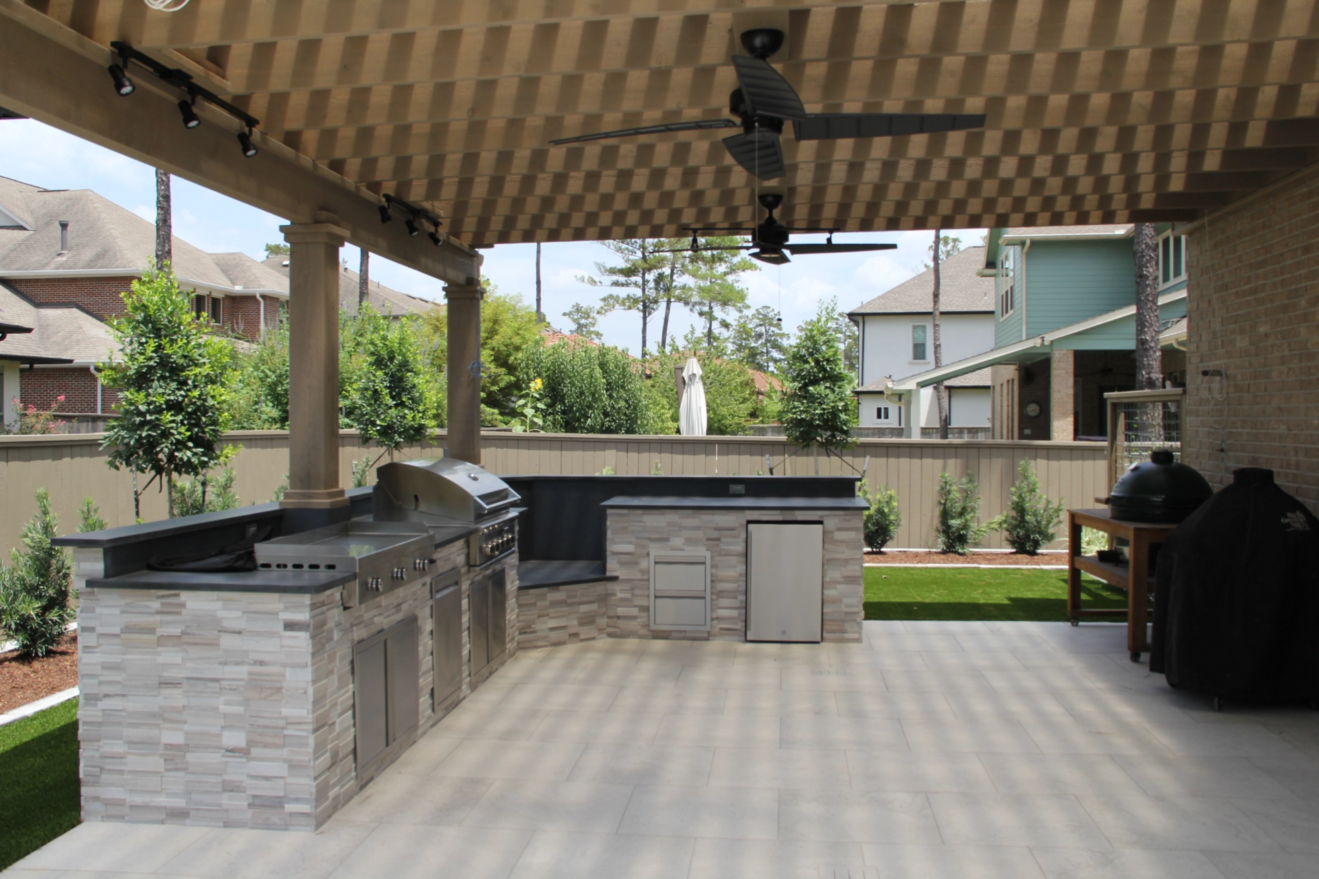 The patio surface throughout the space was finished in modern, slip-resistant porcelain for durability and style. The kitchen countertops were crafted from polished 3CM black granite, bringing weight and elegance to the cooking area. The custom pergola was constructed with cedar and stained to match the home’s palette, adding warmth and cohesion to the space.