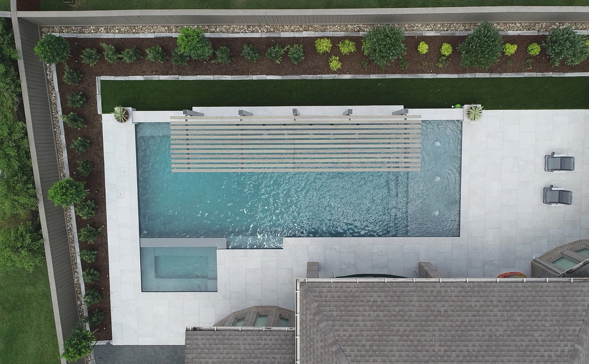 What makes this project truly unique is the custom-built arbor positioned directly above the pool’s water feature wall. This bold design element frames the pool visually, draws the eye from across the yard, and brings architectural scale to the entire backyard. It’s more than a structure—it’s a design statement that turns the pool into a destination.