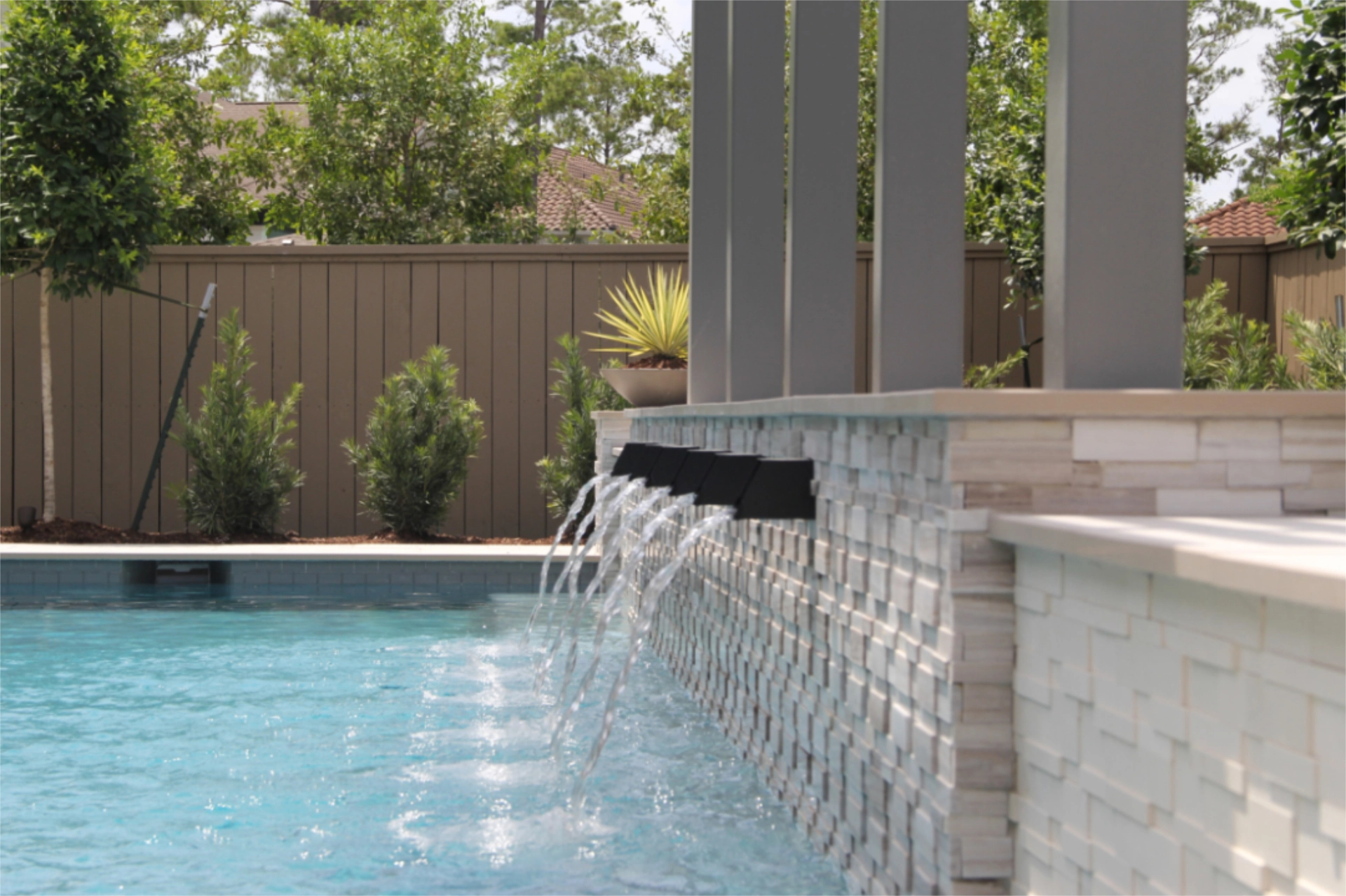 The outdoor kitchen and pool’s main water wall were finished with a rich 3D honed natural stone veneer, creating visual depth and tying together the structural and water features. A lighter version of the same 3D honed stone was used on the pool’s secondary walls and columns to create contrast and balance.