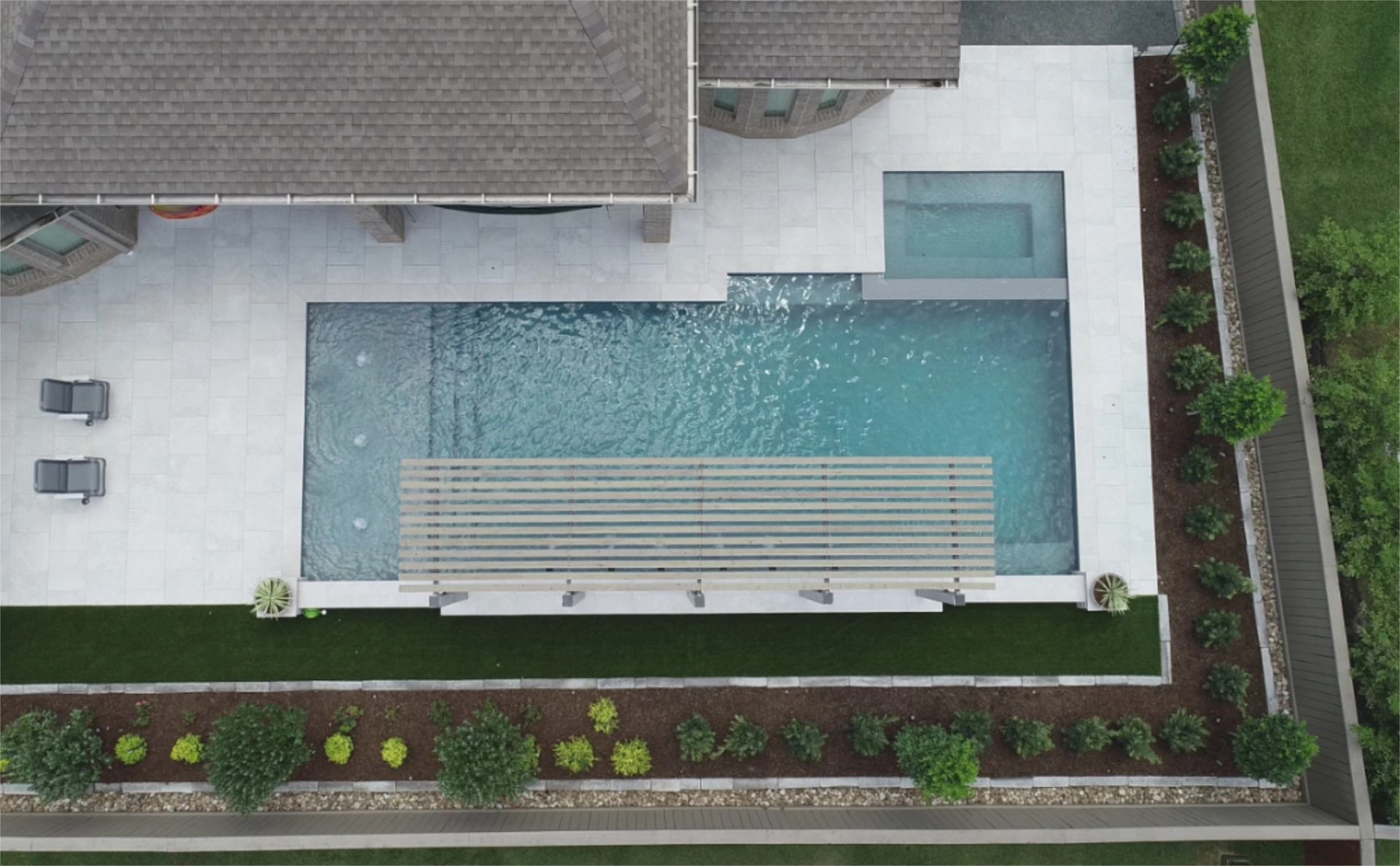 The spa is seamlessly integrated into the pool design, with surrounding water walls finished in a combination of rich and light-toned 3D honed natural stone veneers. Custom powder-coated black scuppers deliver a clean, modern water feature effect, adding movement and sound to the setting.