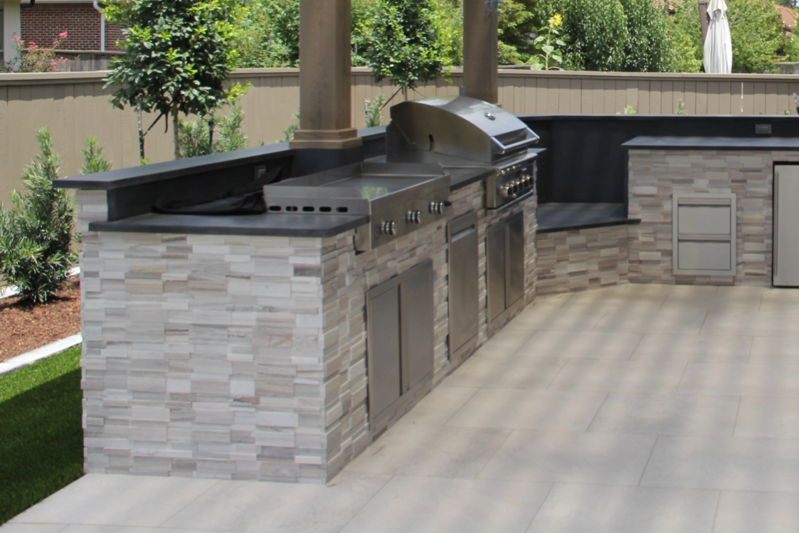 The kitchen’s base was clad in 3D honed natural stone veneer, which matches the pool’s primary water wall—creating a sense of continuity and refinement across the entire outdoor living zone.